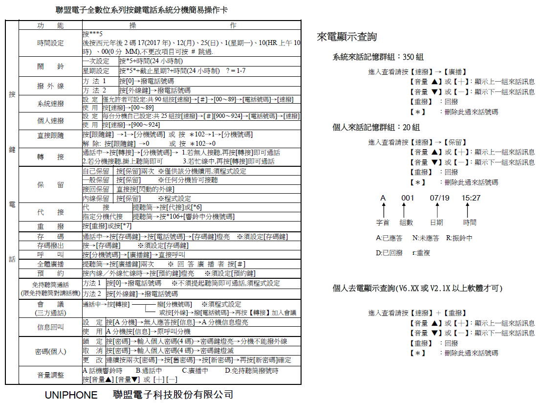 聯盟話機簡易操作卡